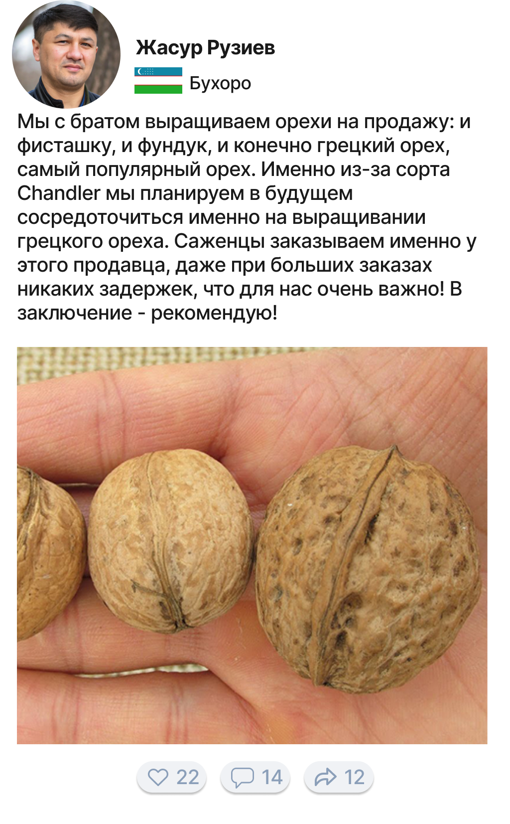Грецкий орех — очень ценный вид дерева, и мы часто не понимаем, что растет у нас под ногами, каким богатством мы обладаем. Грецкий орех очень часто используют в производстве дорогой мебели, орех имеет очень красивый цвет и структуру дерева. Я с семьей выращиваю орехи на продажу уже более 20 лет. 5 лет назад мы начали продавать ореховые саженцы нашим клиентам и каждый раз радуемся, когда им удается вырастить собственные ореховые сады!